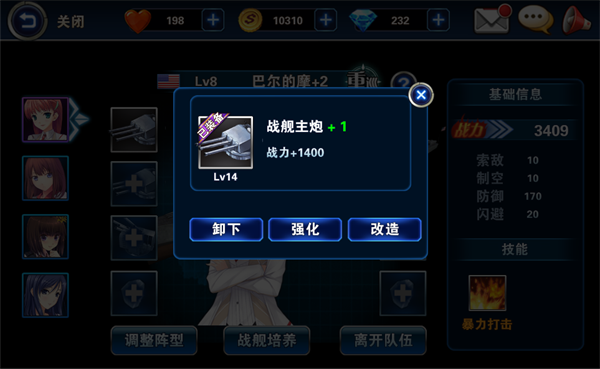 《娘舰》新手攻略 《娘舰》是一款3D海战类回合手游,每艘战舰都有娘化形象,游戏比较讲求玩法和技巧,会玩的非RMB玩家也一样可以非常强大。 首先进入游戏后通过新手阶段,可以获得前期重要的2搜战舰,特别是赠送的紫舰巴尔的摩号是前期推本的主力,把前期送的装备特别是战舰主炮给巴尔的摩号装备上,开始疯狂推本。