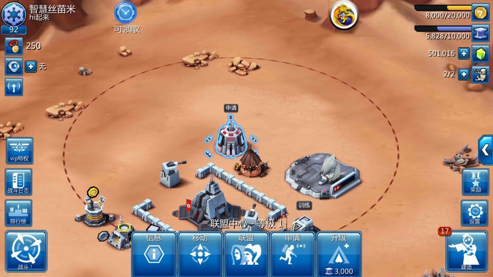 点击联盟中心,会显示一个红色虚线圆圈,这个范围就是驻扎在内的援兵的警戒范围。敌人攻击你的基地时,一旦他们的部队踏入这个范围,联盟中心内的我方援兵就会出现并与他们战斗。那么怎么获得援兵呢?使用联盟中心菜单中的“申请”就可以向联盟成员申请部队了。你也可以在发出申请时打字说明你需要什么类型的部队,比较常用的有飞行摩托(帝国)和反抗军地狱火机器人坦克(反抗军),针对英雄的狙击手更是适用于任何阵营。当然,有借就有还,在接受别人支援的同时,也不要忘记按照他们的需求向他们捐赠部队。打开联盟聊天界面就可以看到联盟成员们的部队申请。到了游戏后期,联盟中心内的部队对基地防御会起到非常大的作用。所以说,早早和盟友们打好关系、达到互惠互利是非常重要的哦。