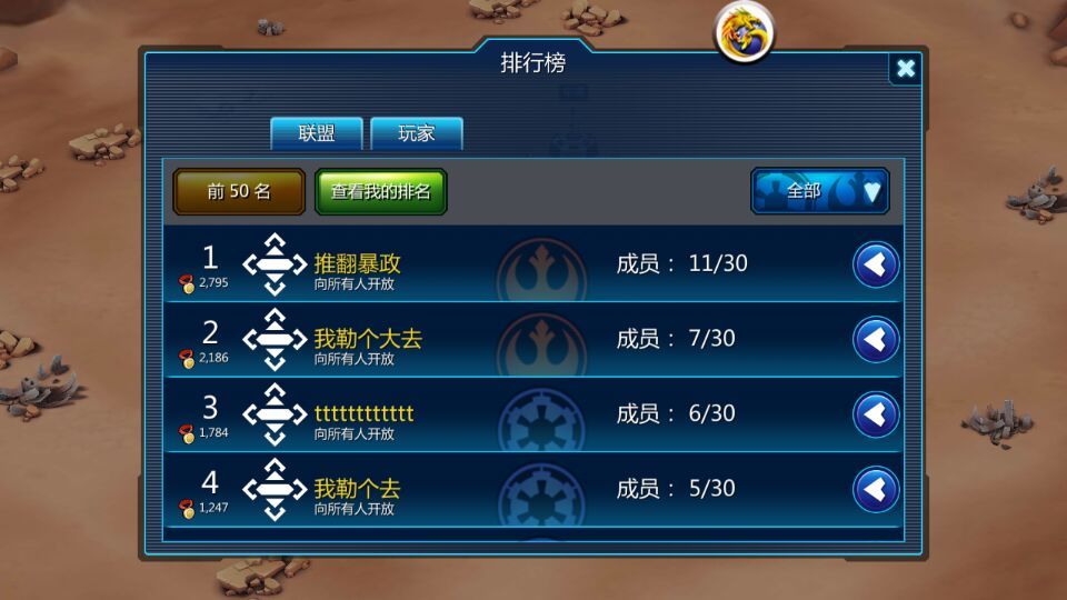 点击主界面左下方的排行榜图标就可以查看联盟排行榜,排行的依据是联盟内所有成员的奖牌数之和。想要取得高名次,就扩大联盟规模吧!努力提升个人实力也是不错的选择。 |
