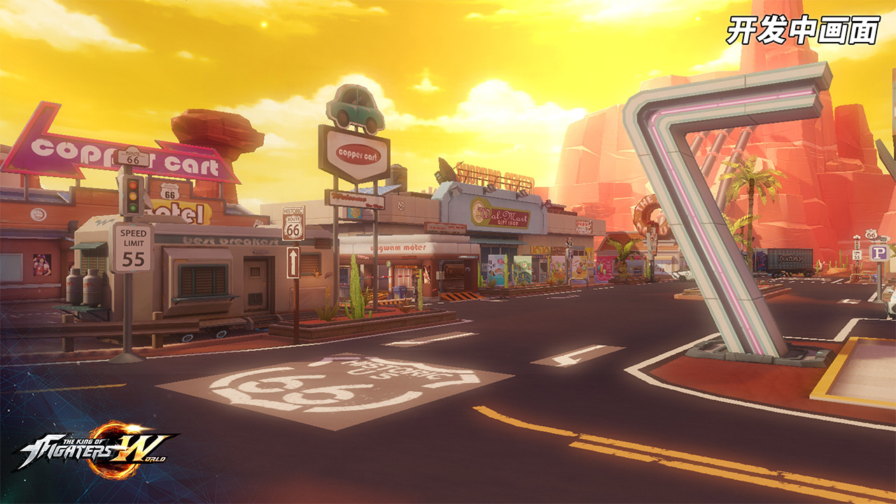 第二维度:近未来3D立体场景 近未来元素是《拳皇世界》场景的基本特征。在游戏场景中,科技元素占有非常重要的地位。以下图片场景取材于KOF中较为经典的场景之一:南镇。场景内随处可见环城道路和都市建筑。带有厚重浓烈的美式风格,玩家将在这张地图中获得更多的代入感!
