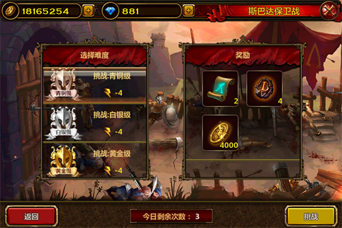 英雄请一定活着回来,别闹我就打个低级版本不会挂。《全民骑战》斯巴达活动分成三大难度,20级青铜,35级白银,50级黄金。不同等级面对的怪物强度不同,当然奖励也是不同的,越高级奖励越丰厚。不过这里提醒大家的是,斯巴达副本没有时间限制,但是挑战一样需要消耗体力,挑战次数会在第二天刷新。
