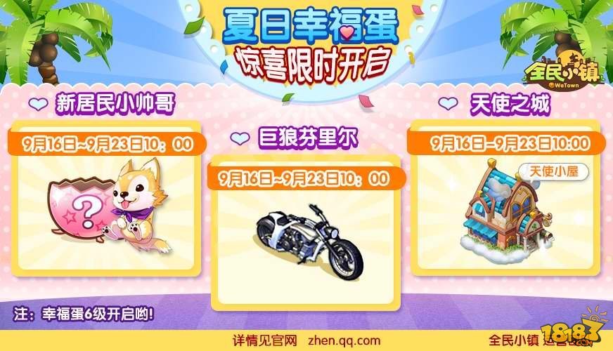 活动时间:2014年9月16日-9月23日10:00 活动规则:“小师哥”幸福蛋豪华阵容齐亮相,可爱可爱的呢!神圣的命运女神之泉,精灵集会所。还有10000金币等超级豪华礼品在其中,真实弥足珍贵的奖品啊! 【活动五:天使之城幸福蛋回归】 活动时间:2014年9月16日-9月23日10:00 活动规则:天使之城幸福蛋再次展现世人,幸福蛋中各种惊喜光临小镇,为您的小镇增光添彩。精品与新品的碰撞,灵感与美感的结合,打造最完美的小镇风光。 【活动六:“伯爵夫人”任务】 活动时间:2014年9月16日-9月23日10:00 活动规则:在活动期间内,顺序完成要求全部任务,任务奖励A车“伯爵夫人”。好想现在就把A车精品“伯爵夫人”带回家! 有爱提示:最低可接受任务的等级为15级。 【活动七:限时商城再曝新品与绝版】 活动时间:2014年9月16日-9月30日10:00 活动内容:限时商城除了为大家补充高级麦片工坊,让你的小镇展现收获的景象,并为大家带来“围墙”系列新建筑。让小镇更有安全感,格局分布更加明朗,墙体的设计会使小镇更具有自己的风格哦。 【活动八:“女王纪念碑”任务】 活动时间:2014年9月16日-9月23日10:00 活动规则:在活动期间内,完成连续任务可以获得女王纪念碑,这是身份的象征,也是小镇的无上荣耀。如果你喜爱这件精品,那就快快升级你的小镇呦! 【活动九:收爱心掉金币,有几率爆经验】 活动时间:2014年9月20日-9月22日每晚21:00-22:00 活动期间,在爱心基础掉落的基础上会有额外掉落100%金币掉落,还有机会爆出大量经验,同时,所有好友家的爱心将于21:00重新补满,让您瞬间变成百万富翁。 相约小镇,欢乐不停;收爱心,拿金币,在小镇的每一天都让你有满满的收获!魅力、金币送不停,在欢度周末的同时,各位记得要上线领礼包哦! |
