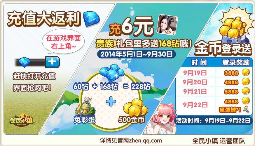 活动时间:2014年9月19日-9月22日23:59 活动规则:《全民小镇》登录有礼。活动期间,镇长每日上线,即可通过游戏邮件收到登录礼包一份,金币从天降,人人有份。 9月19日 3888金币 9月20日 4888金币 9月21日 5888金币 9月22日 4888金币+砸蛋锤*1 【活动二:金币B车“巨狼芬里尔”幸福到来】 活动时间:2014年9月16日-9月23日10:00 活动规则:金币B车“巨狼芬里尔”幸福蛋全新上市,复古双层巴士、鲜花廊亭小师妹统统都好想要啊!砸出幸运砸出快乐,“巨狼芬里尔”浓情上市。 【活动三:“灵魂战车”幸福蛋回归】 活动时间:2014年9月16日-9月23日10:00 活动规则:灵魂战车荣耀登场,砸出幸运更带来无限惊喜,曾经灵魂战车系列装饰没有集全的镇长们可以下手啦! 【活动四:新居民“小帅哥”超萌降临】