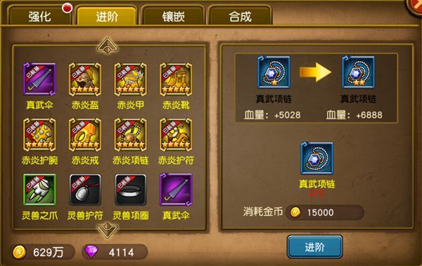 原先的版本中,低品质的装备需要收集该装备的碎片来升级成更高级的品质。这个升级的过程就叫做进阶。但是碎片收集费时费力,玩家的装备成型速度并不快。现今版本中,玩家只要获得同一颜色的同一件装备,只要数量够多,就可升级,进阶成更高级的颜色品质。加之新版本中,装备掉落概率大大提升,几乎每个小关卡都能掉落1-3件不同装备,更不要说BOSS关卡,蓝装、紫装直接掉落的可能性都是十分高的,从此进阶之路一路平坦,玩家们的神装梦将不再遥不可及!