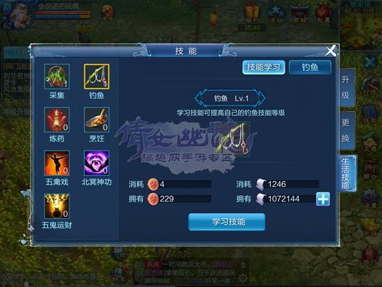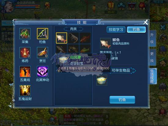 倩女幽魂手游钓鱼技能有没有用?倩女幽魂手游钓鱼技能要不要学?下面小编就为大家分享倩女幽魂手游钓鱼技能详解,希望对大家游戏有帮助! 生活技能——钓鱼 技能说明: 钓鱼,得到的材料可用于烹饪; 钓鱼流程: 1、玩家学习钓鱼技能后,点击可以钓鱼的相应肉类,再点钓鱼即可; 2、自动寻路到钓鱼地点后,点击“开始”便可钓鱼; 注意,在钓鱼的过程中,会有几率获得可伴生的物品(相关物品,可查看文章底部的表格); 钓鱼物品大全:
