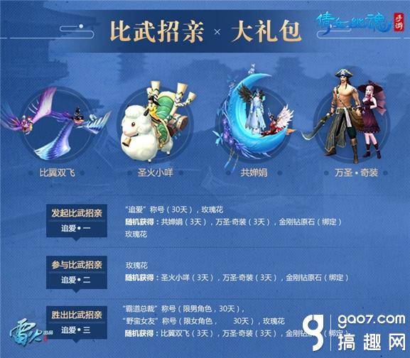 参与100%得个性称号,求爱成功即得定情道具 此外,少侠们参加比武招亲或者举办擂台,都有机会获得游戏内礼包奖励。发起比武招亲的少侠,将会获得独家【追爱】称号以及象征爱情的玫瑰花,并将随机获得双人坐骑【共婵娟】、【万圣·奇装】等奖励。参与并响应并打擂的玩家,也有好礼可得,杨洋同款【圣火小咩】没准就是你的新坐骑了。最后,打擂成功的男女玩家,将分别获得【霸道总裁】或【野蛮女友】的称号,个性十足!