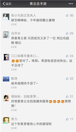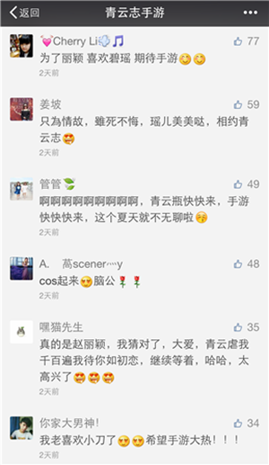 由欢瑞游戏、完美世界、芒果互娱三方联合发行的《青云志》电视剧唯一正版手游于7月15日正式公布了第二位代言人——《青云志》电视剧女主碧瑶的扮演者、超人气偶像赵丽颖。一时间在网络上吸引了超高的关注度。赵丽颖本人也在微博上晒出了自己在《青云志》手游中和形象及游戏海报,该微博一天时间内被迅速转发达20万次!而《青云志》手游的微博话题阅读量也一跃飙升至1.5亿次!达到手游界之最!成为史上最受关注的手机游戏! 图1