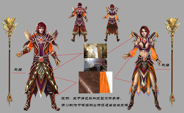 此图为《热血传奇手机版》法师形象的人设初稿,完美的九头身,起肩的盔甲式硬挺造型,配以绫罗绸缎的轻柔,形成一幅刚柔并济的女士形象。