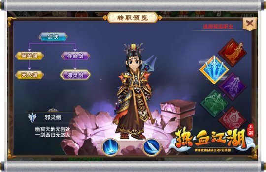 正邪不两立 转职江湖宽 虽然在《热血江湖手游》中正邪与本性善恶无关,但玩家在选择阵营进行转职后,将不能更改。有江湖的地方就有斗争,所以正邪阵营选择除了喜欢与否外,也需了解对应的转职职业,因不同职业代表不同的战斗方式,是雷霆霹雳还是随风潜雨都看个人喜好。