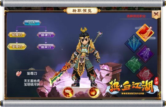 《热血江湖手游》中目前拥有刀、剑、医、弓、枪五大职业,每个职业都可以自由选择转职成为正派职业或邪派职业,因此五大职业几乎变为了十大职业,且均有自己的风格特色,让每个玩家书写属于自己的个性化武侠,享受真实武侠世界的体验。