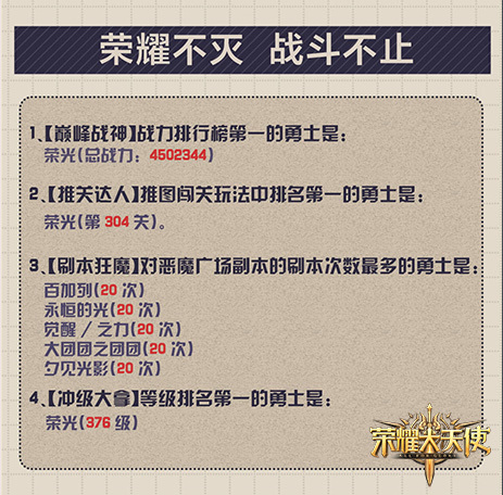 全服个人最高战力超过450万 在为期3天的冒险探索中,天使大陆诞生了无数出色的勇士,他们积极地探索这片广阔浩瀚的世界,在各个地图场景、副本秘境留下足迹。他们的故事被吟游诗人传唱,并铭刻于天使大陆的编年史册中。 其中,战力排行榜第一的勇士名为:荣光(总战力:4,502,344) 其中,推图闯关玩法排名第一的勇士名为:荣光(第304关) 其中,等级榜排名第一的勇士名为:荣光(376级) 其中,对恶魔广场副本讨伐次数最多的勇士分别为(按时间先后统计) 第一名:加百列 第二名:永恒的光 第三名:觉醒/之力 第四名:大团团之团团 第五名:夕见光影