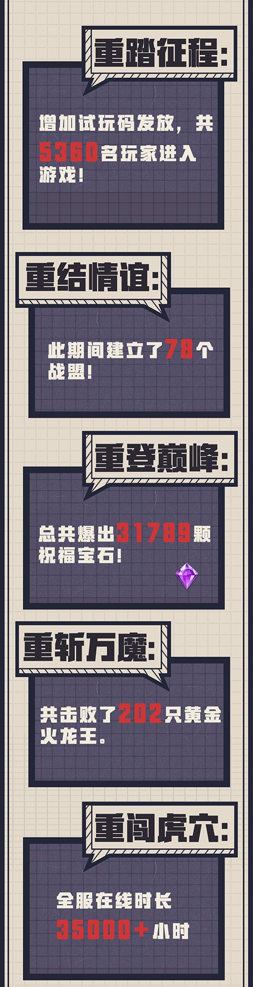 大陆共创建战盟盟约:78个 神圣的号角响彻天使大陆,光明与黑暗之战愈演愈烈。在《荣耀大天使》首席体验官Uzi的带领下,勇者在圣光下集结,他们或合纵连横,或独领风骚,共计建立了78个强大的战盟,开辟了一场声势浩大的魔幻征程! 总共掉落祝福宝石:31789颗 没有一颗祝福宝石能逃过冒险者的双眼。活动期间野外或副本共计掉落31,789颗祝福宝石;连起来能绕天使大陆三圈。按照道具掉落概率换算,游戏中每5分钟就有1200只怪物被玩家击败。 黄金火龙王累计被击败:202次 作为《荣耀大天使》BOSS实力担当之一的黄金火龙王,这三天的生活也过得十分激情。由于常年携带重宝出没,冒险者纷纷向它发起讨伐。截止活动结束,黄金火龙王共计被天使大陆的勇士击败202次,损失个人财富价值更是无数! 全服在线时长超过35000h 12月17日10:00时《荣耀大天使》先锋试玩服开启,共计超过5,360名勇士进入天使大陆参与试玩体验。截止12月19日试玩服正式关闭,全服在线时长累计超过35,000个小时。