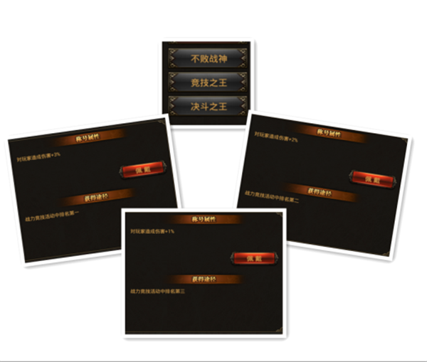 【竞技称号】 传说中的竞技场,就像爬楼一样一步一步的向上爬,当玩家在竞技场战力排名前3的时候,每位玩家获得不同的称号,第一至第三分别是:“不败战神”“”“决斗之王”,加成都是最好的,分别对玩家造成3%-1%依此递减。想拥有改称号,就要看看你有没有那个本事了!