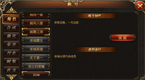 【攻城称号】 之所叫“核心”攻城战的称号,固然少不了,每次攻城战都是腥风血雨,拿下杀城的公会更是独当一面。所有公会成员,会长获得杀城霸主称号,其余会员全部获得杀城英雄称号。所有称号都是身份的象征,虽然没有任何加成但是这是我拿下杀城的努力回馈!