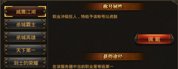 【等级称号】 首先,玩家到达40级就会开启第一个称号,锋芒崭露,每隔10级开启一个称号,一共4个,其中有一个本职业等级第一称号最为珍贵,“XX的荣耀”该称号象征了本职业中的王者诞生!其余称号角色达到等级后自动激活,所以等级称号都没有任何加成,不过这个是进入江湖的见证!