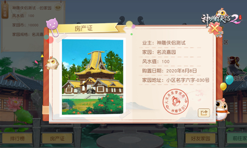 当大侠购得家园,还能得到神雕江湖特许房产证一枚,证明大侠也是在江湖里有房的人。并且会附送家具一套,拎包入住,省心更贴心!