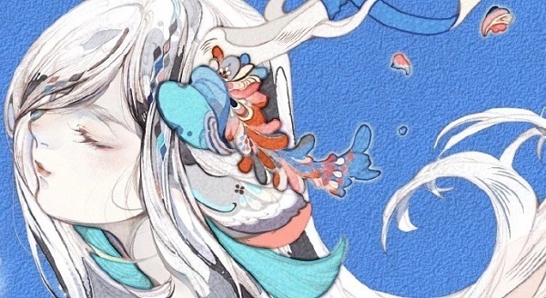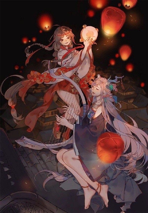 “毛糰小劍劍”创作的同人作品算是个中最贴合原著人物性格的,在一轮黄色的皓月下,鹿蜀半坐在地上,以手附箜篌。双眸紧闭,看上去是一脸的哀怨凄凉,可能是想起先辈们惨痛的经历,以及自己现在孜然一身的处境,加之圆月的感染,不禁自弹自哀。