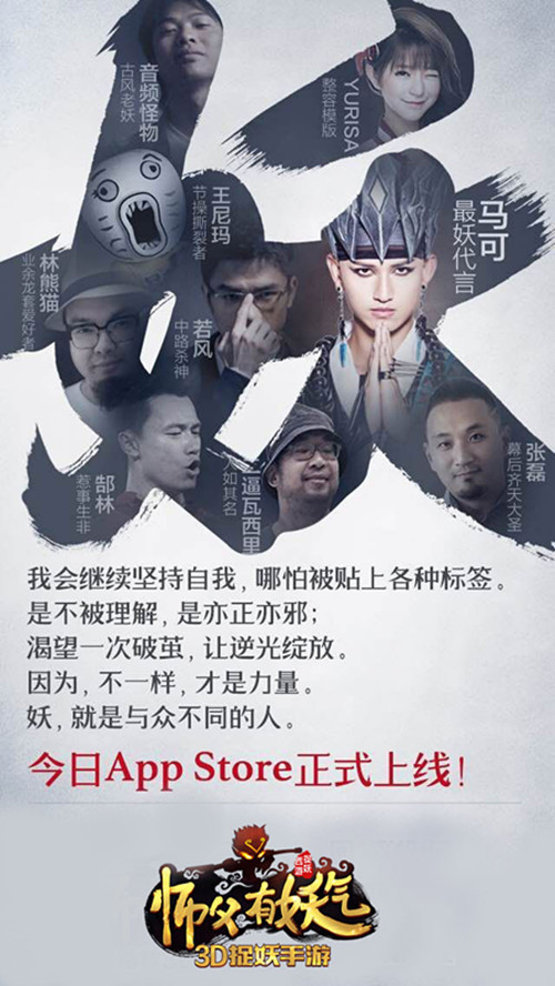 史上最多代言人手游 马可成为“最妖代言” 《师父有妖气》尽数收录了仙、魔、佛三界名妖,他们不仅个个天赋秉异、妖力非凡,也代表了“与众不同个体”和“不被理解的少数” 他们充满有个性、有追求,不流俗。这种“妖文化”带来了49位包括郜林、王尼玛等同样充满这“妖气”的“特妖代言人”,让《师父有妖气》成为了史上代言人最多的手游。这些“特妖代言人”来自、演艺、时尚、体育、广告、ACG等众多圈子, 其中扮演热播剧《花千骨》中妖王“杀阡陌”的演员马凭借高颜值和最妖气质成为“最妖代言”。