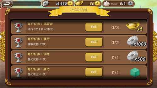 进入游戏后不知道该干些什么?宝宝别怕,和我一起来完成日常任务吧,还有元宝、银币、宝箱等奖励送哦!而且这些任务完成起来也很简单,共有5项,包括进行3次多人对战、抽取武将卡2次、强化武将卡1次、强化君主卡1次、日常任务完成4次。