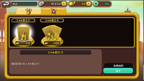君主卡每XX小时可免费抽取1次,随机获得1张2—4星君主卡。