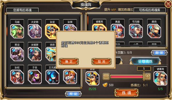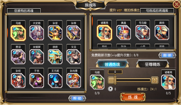 炼魂也是大家最关心的,炼魂分为两种形式,一者普通炼魂、一者至尊精炼。普通炼魂兑换比例30:1,同时兑换需消耗一定的银币。至尊精炼需VIP5方能开启,兑换比例5:1,兑换需要花费一定的元宝。