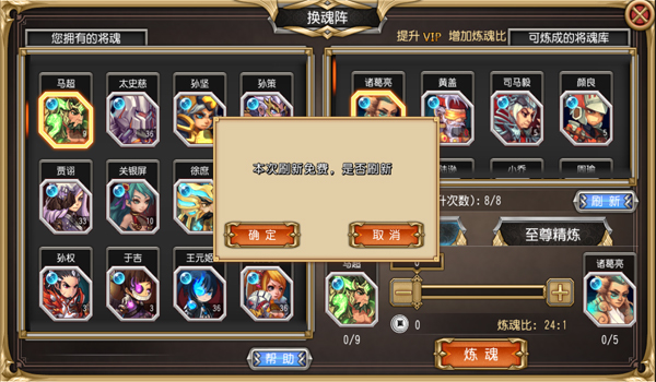 可炼成的将魂简单来说就是可兑换将魂,玩家每天有免费刷新次数,每次刷新8个,随机出现8个不同将魂,每个将魂5个碎片。当武将不符合你的需求时,可进行付费刷新,每次刷新消耗相应的元宝数量。同时兑换将魂数量没有上限。