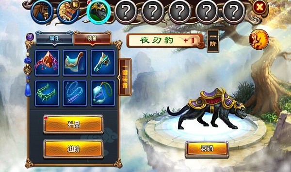 坐骑的升品通过坐骑装备实现。每次升品前需要收集6个同品质、符合坐骑当前等级的坐骑装备。6件装备集齐后,就可以升品了。一定数量的低级装备可合成下一品质的高级装备。升品后的坐骑,技能更加强力,画面也更华丽。 坐骑装备获取地点:市集里面军需大帐、黑市。
