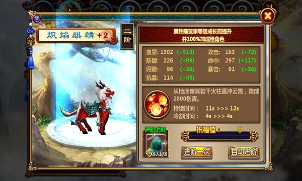 坐骑的进阶需要通过坐骑碎片实现,最高十阶。进阶后,外观会发生明显的变化,更加炫酷;坐骑技能的持续时间增加;坐骑技能的冷却时间减少。 坐骑碎片获取地点:吞食天地博望坡之战、剿匪关卡、市集猜拳高手、杂货铺、签到、排位赛。 |