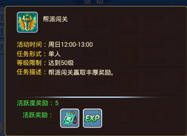 帮派闯关是帮派重要活动之一,可以获得帮贡和帮派经验奖励,想升级帮派,共建和谐大家庭吗?那就不要错过帮派闯关活动。 帮派闯关简介: 活动时间:周日12:00-13:00,每周一次,持续时间短,定个闹钟吧骚年。 任务形式:单人,虽然是单人挑战,但是积分算的是帮派所有人的总和,所以帮主要发动帮派所有人积极参与,毕竟帮派不是一个人的,大家一起努力吧。 等级限制:50级,只有50级以上才可以参加,想要做贡献拿帮贡,就要努力升级了。