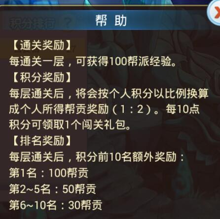 闯关奖励:进入帮派闯关之后,在界面左边就会看到积分统计,包括帮派总积分和自己的积分,还可以看积分排名,以及奖励机制说明,怎么样,是不是心动了。