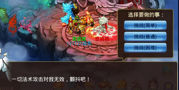 NPC4:软绵绵 特点:免疫法术伤害,软小妹会禁言咒,造成无法使用技能,软小角则会缚身术,造成灵巧度降低,另外还会龙卷气旋降低命中。但是物理防御低,血量也很低。 玩法:软小妹和软小角的血量都很低,输出一般,只要使用强大的物理输出阵容,就能比较轻松的挑战成功。物理输出的星将比较多,可以任意挑选,就不做特别推荐了。阵法推荐使用暴力输出的方圆阵。另外还有个小技巧,宠物忘记换,只带有法术输出技能技能的,可以不选择技能,直接点攻击,这样是算物理攻击的。