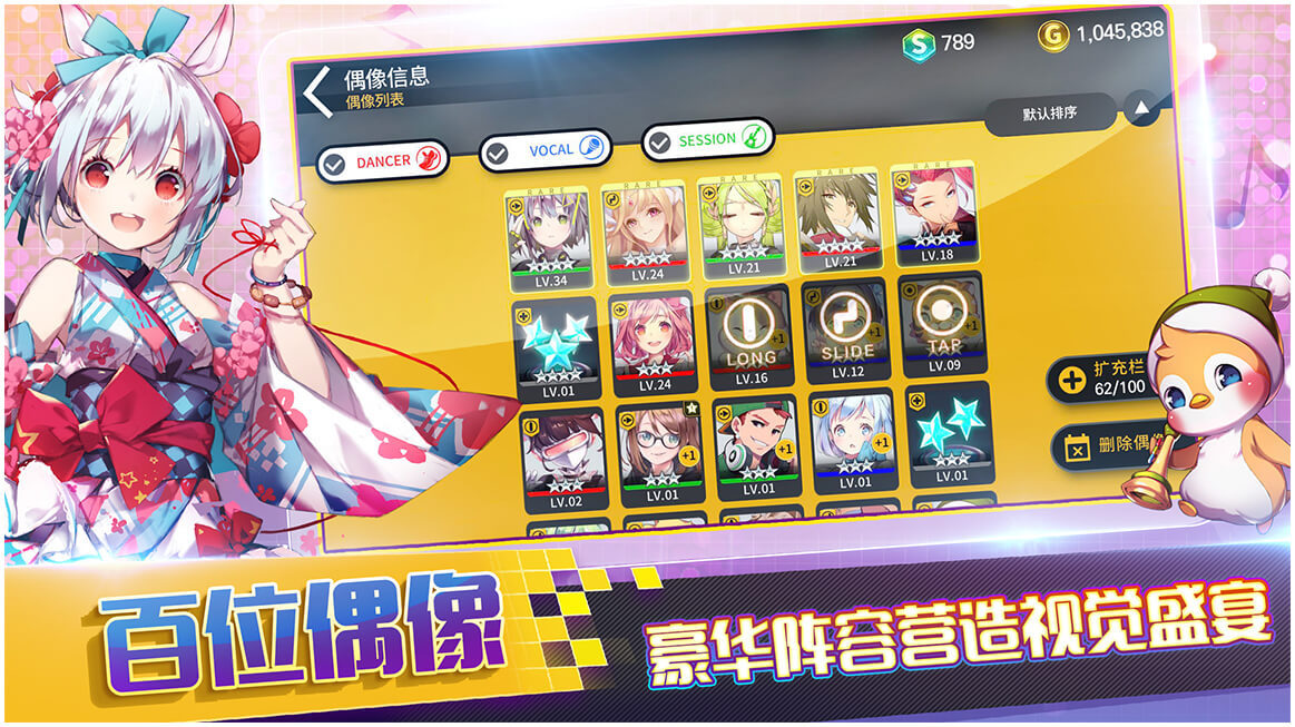 《偶像超音速》是DJMAX正版授权的音乐手游,曲库内含百首正版DJMAX音乐。游戏集传统音游玩法、人物养成、地图冒险等诸多元素于一体。在《偶像超音速》的世界中,你需要在舞蹈、演奏、主唱三个职业的偶像中组建属于你的偶像团队登台演出,冲击大奖赛的冠军!