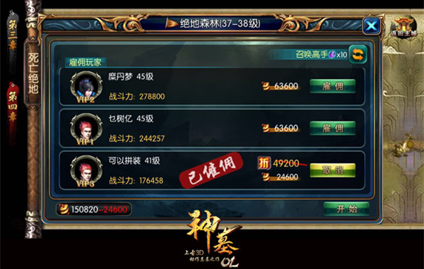 好友都不在线的话可以通过副本内“雇佣玩家”页面来雇佣高手帮你打怪,系统会随机分配一些玩家供你选择,玩家可根据角色等级、VIP等级、战斗力、所花费铜钱数来选择一个性价比高的玩家进行雇佣。如果系统随机分配的人中有你的好友,那么你还可以获得5折的折扣价,雇到绝对赚到。在战斗中有个实力强大的伙伴陪在你左右,就算是再强的BOSS都得为你们退让三分咯! 图4:在副本“雇佣玩家”中选择性价比高的玩家雇佣协助战斗