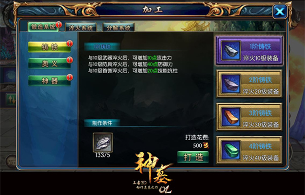 在《神墓OL》加工系统下细分3个分支系统,它们分别是锻造系统、淬火系统和分解系统。锻造系统主要用于打造装备增强的必要材料(铸铁、奥义)和锻造神器套装,如果你想提升装备的附加属性,那么锻造系统是你强化装备的奠基之路。今天,我们就来详细讲一讲锻造系统入门的那点事儿。