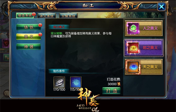 奥义一共分为3种,分别是人之奥义、地之奥义、天之奥义,奥义的制作方法与铸铁大同小异,不同的是奥义需要消耗一定量的碎铁和奥义灰烬,奥义灰烬主要出现在蕴灵矿洞、神魔复苏、商城道具等地方,如果急需要大量的碎铁和奥义灰烬不妨到商城中的[道具]处购买。满足对应条件后,直接点击“打造”即可获得相应的奥义。