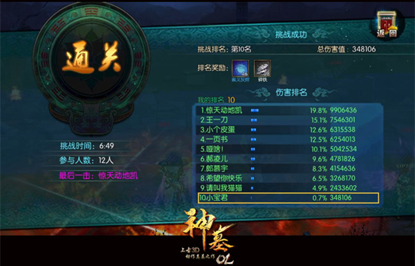 为确保玩家能够在打BOSS时候更得心应手,建议玩家在等级达到37级以上便可参与挑战BOSS的活动。在《神墓OL》里,BOSS分为黑起和大魔,黑起挑战的开启时间为12:00-12:30,大魔挑战开启时间为晚上20:30-21:00,在规定时间进入方可挑战。在挑战中,系统会根据玩家给予BOSS的伤害进行排行,排行居前位的玩家将获得丰厚的奖励,奖励包括奥义、装备升级所需材料等物品,倘若你在人群中的杀伤力足够强,能够给予BOSS致命一击,还可以额外获得地之奥义、神器图纸碎片、幻化之尘这三大奖励哦~ 图4:系统根据玩家给BOSS的伤害进行排行给予奖励