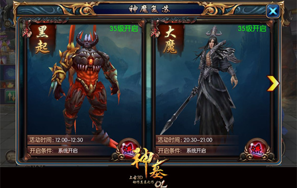 相传,《神墓OL》里有两大邪恶BOSS--黑起和大魔,两大BOSS均为太古七君王成员,其实力更是不容小觑。黑起,幼年时曾被人逼迫生吃了自己的父母,后又被逼迫吃掉自己妻儿,曾斩杀四十万心腹,生性极端残忍,闻其名者俱胆生寒意。大魔,乃魔主之子,五千年前斩杀邪道双兄弟,死后千年尸身不坏,舍去仙灵气成就大魔身。两大BOSS血量极其惊人,即便没穿盔甲也没拿任何武器,就可以将一众人瞬间撵成肉沫……听到传说中的两大BOSS是不是有些心惊胆战?不过在游戏中你无需一对一应战,会有很多小伙伴陪你一同击败他们。如果你觉得自己不惧任何妖魔鬼怪,不妨就来挑战一下终生难见的两大BOSS吧! 图2:挑战黑起和大魔