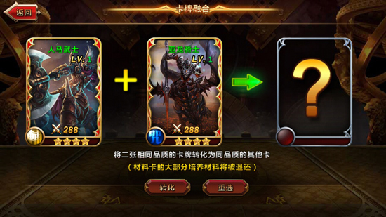 卡牌融合中玩家能够将两张同星级的卡牌转化成同品质的其他卡牌。在转化时材料卡大部分的培养材料将被退还。对玩家们来说,这又是一个赌运气的好机会,你永远不知道转化出来的下一张卡是战神还是弱鸡。但大量培养材料的返还也够玩家去培养其他英雄了。以上就是《神魔之战》英雄重生、转化的介绍。玩家们在培养英雄的时候一定要认准了,除非土豪大R,重生、转化需谨慎哟! |