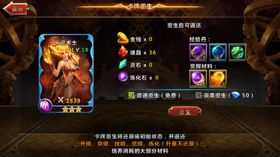 在重生系统中玩家可以将选择的卡牌还原成初始状态并返还经验丹和觉醒材料,但英雄仍然保持着重生时的星级。在重生时,玩家可以选择普通重生还是花费50钻石完美重生。普通重生返还的材料大概是完美重生的60%。玩家要根据英雄的培养情况选择合适的重生方式。
