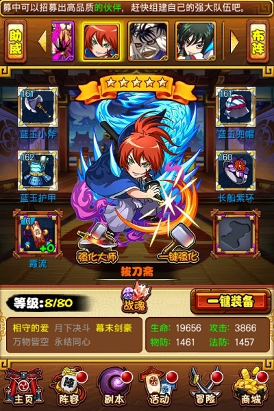 游戏系统:7.0/10分 《少年剑心》游戏的操作相对于其他卡牌手游来说比较简单,因此游戏中的系统主要分为六大板块:战斗模式、神将招募、装备系统、宝物系统、冒险系统和活动系统。其中战斗模式各位玩家们不需要去care,因为全自动的战斗方式根本就没有你插手的份儿。对于神将招募来说,13资质橙色武士是必须要配备的,这样有助于你打怪升级,走向人生巅峰。但是13资质橙色武士的招募不是那么容易的,所以玩家们还是要耐着性子。小编在这里还要提醒给位玩家一句:“竞技场要等到14级之后才能开放”,因此在这之前就只能在副本中打打小怪兽咯。