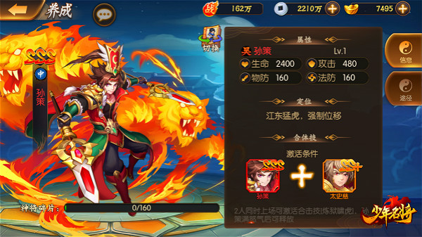 【乱世神将 勇斗江东】 在这《少年名将》中,要说小编最喜欢的英雄,那非江东小霸王孙策不可。超凡的群攻物理伤害,还有高概率的额外攻击,都会是你胜利的保障。孙策这位3S级神将不光自身实力爆表,还能不断吸附敌人的攻击,为全队增加持续性的攻击加成。有这种红将在手,还愁三国不定?