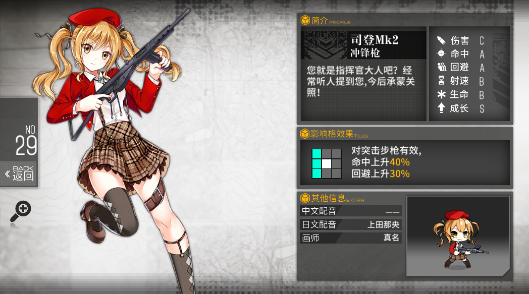 只有一把冲锋枪值得用,嗯没错,司登MK2,冲锋枪放到前排,对于手枪来说加命中和回避率无疑是弥补了手枪在射程方面的不足,对于双马尾的复古MK2来说,掩护手枪的任务简直是轻车熟路,建议在梯队冲锋枪量少的时候用MK2做队长,这样不仅能够让命中率提高,也能更加养眼哦~