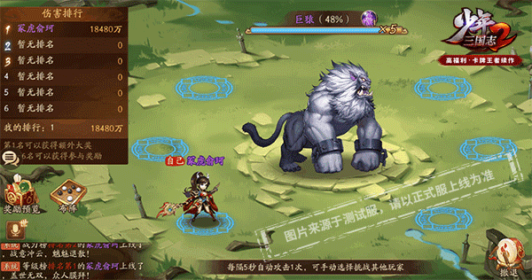 高福利卡牌王者续作《少年三国志2》新版本「秘境风云」上线后,传说中的神兽正式登陆战场,成为了少年们征服三国不可或缺的伙伴;不过,依然还有不少强力的神兽藏匿在秘境之中,单以一人之力恐难征服,快喊上好友一起来打Boss吧!