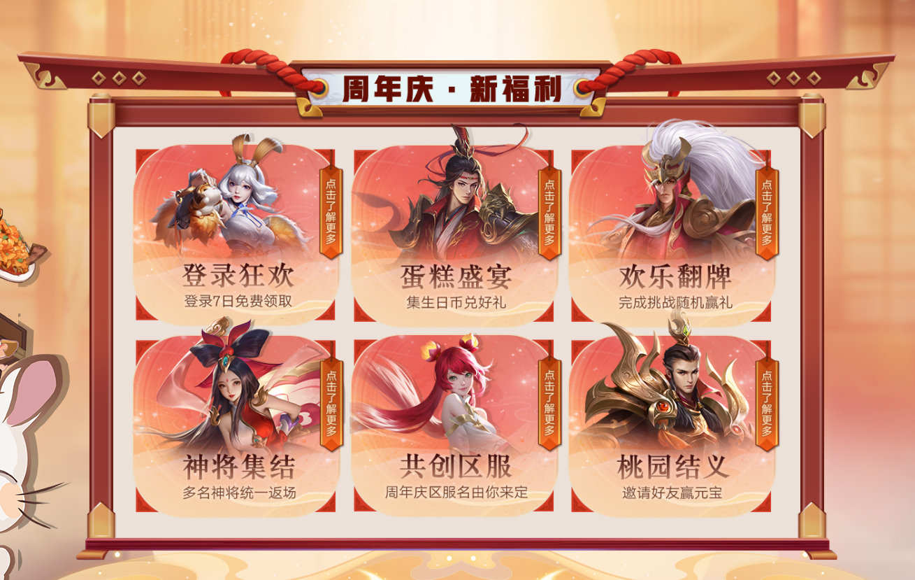 六大福利,全面开启,活动期间,福利不断!神将集结,统一返场。甄姬皮肤,甜蜜来袭。连续登录即送全民好礼,更有其他活动参与即有机会获得神将和元宝奖励。 【少年启航 展望全新未来】