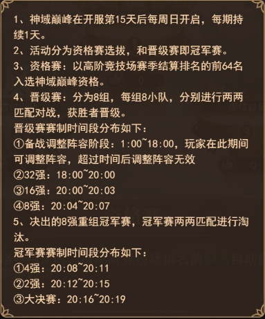 一、神域巅峰开服15天以后每周日开启,特别要注意的是调整时间是1点到下午6点,其他时间不可以更换阵容