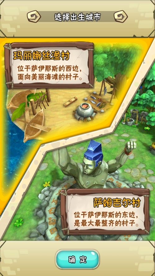 最后,小伙伴们只要再选择角色在石器大陆的出生村落,就可以完成创建角色开始石器冒险了。这两座备选出生渔村分别是——“玛丽娜斯村”,面向美丽海滩的村落,以海产丰盛而著名,村民相当温和可亲,而所谓的“玛丽娜斯”指的就是“海的精灵”;“萨姆吉尔村”,以英雄萨姆基鲁为名,村中有座巨大的英雄雕像,是最大最整齐的村落。