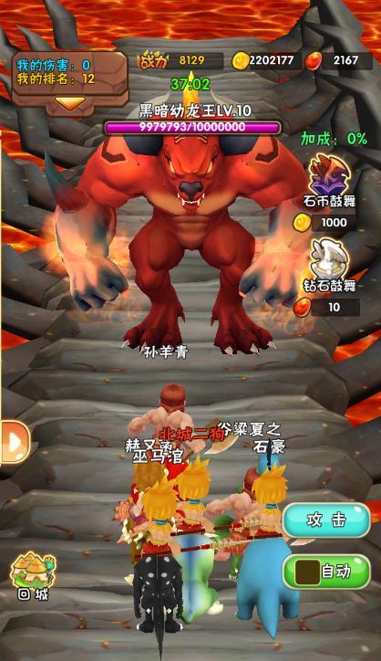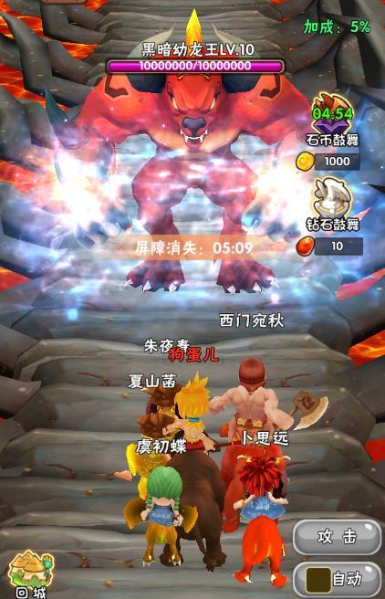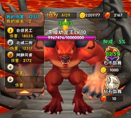 在每日21:30分保护光罩消失后,就可以跟其他勇士小伙伴共同挑战世界boss黑暗幼龙王了。挑战前玩家可以消耗金钱石币或龙蛋增加自身角色、宠物的战力,从而提升挑战boss时的伤害量。