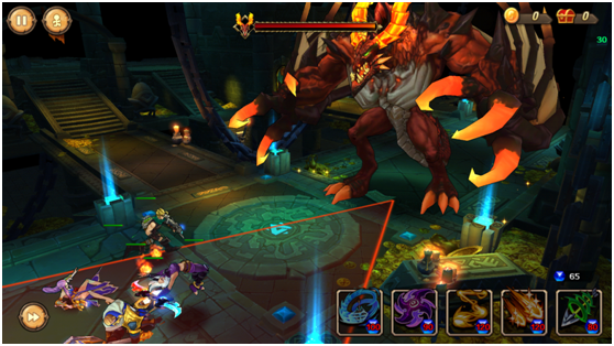 一轮技能施放完毕,BOSS的第二个技能喷火也出现了,由于地形原因,只有在BOSS的上下两边是安全的,一旦BOSS出现喷火技能,赶快按暂停,这时候就不要考验你的手速了,因为BOSS技能伤害很高的,很可能造成减员,把英雄移动到巨龙两侧,躲避开喷火技能,如此循环直到打倒巨龙。 |