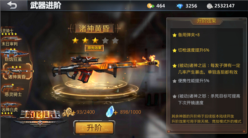 这把枪的原形是曾经的狙击之王巴特雷,二者同样在破坏力上以毁灭一切著称,但是在英雄进阶之后,原本黑银相间的枪体被火焰所包围,它的毁灭气息真正的得到了启用,由内而外的向外散发而去,让诸神黄昏已经突破天际的伤害更上一层楼。 进阶后的它,才是真正名副其实的诸神黄昏! 进阶属性令人垂涎 最强狙击助你称王! 其实在未进阶之前,诸神黄昏就以极高的威力,完美的精准度,以及强大的穿透能力在狙击枪中独步天下。而进阶之后,它的到的属性加成直接让这把枪几乎不存在缺点。 神器进阶总共有五个阶段,解锁每个阶段,都能带来相应的属性加成,让武器一步步的趋于完美。