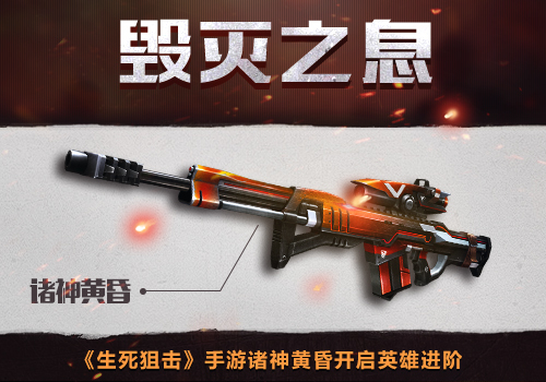 但是英雄武器也并非一把枪的尽头,因为神器进阶系统的存在会让英雄武器也能得到进化,从而拥有更强大的力量,在第一批的武器进阶蜕变名单中,魔龙骑士、炎魔咆哮、皓月神弓、圣光骑士一马当先,不同类型、不同玩法的枪械均有涉及。 而现在,在游戏中人气颇高的英雄级狙击武器诸神黄昏,也终于开启了属于它的英雄进阶,即将拥有更为强大的力量! 毁灭之息震撼人心 诸神黄昏开启进阶 诸神黄昏,顾名思义,它被研发出的目的就是要摧毁一切,哪怕是神明!之所以研发人员胆敢以如此强大的代号来命名它,一切的自信都源自于那一段浑身散发着毁灭气息的迷之金属。 没有人知道这块金属源自于哪里,但是被发现之后,它浓烈的毁灭气息瞬间导致了挖掘人员的死亡,在经过科研人员的细心研究之后,他们选择将它打造成一把令众神也为之颤抖的武器,那就是诸神黄昏。